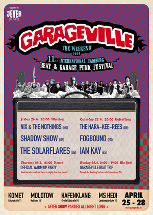 Seit 2012 im Molotow und Hafenklang beheimatet und mittlerweile eine absolute Institution im internationalen Beat, Garage und Psych Circus, bietet das Garageville Festival auch 2024 wieder ein killer line-up mit insgesamt 6 Bands aus den USA, Norwegen, Großbritannien, Spanien und Deutschland.
